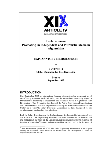 "On 5 September 2002, an International Seminar bringing together representatives of the Afghan government, local civil society and the international community adopted a Declaration on Promoting an Independent and Pluralistic Media in Afghanistan (‘the Declaration’). This Declaration, together with the Policy Directions on Reconstruction and Development of Media in Afghanistan issued by the Minister for Information and Culture on 6 June (‘the Policy Directions’), constitutes the basic framework for the development of media policy in Afghanistan. Both the Policy Directions and the Declaration are firmly rooted in international law and standards. This Explanatory Memorandum seeks to elaborate the international and comparative law basis for the Declaration, particularly relating to the guarantee of freedom of expression. It draws on international law, as elaborated in the decisions of international courts and authoritative international statements, as well as leading national court decisions interpreting constitutional guarantees of freedom of expression. It is intended to contribute towards implementation of the Policy Directions and Declaration. Where possible, specific suggestions are made for the practical implementation of individual action points mentioned in the Declaration. This memorandum first discusses the importance of freedom of expression in a democratic society, with particular emphasis on the special role of the media. It then provides a commentary on those issues addressed in the Declaration which are of a legal or regulatory nature, including public service broadcasting and the promotion of an independent and pluralistic media." (Introduction)