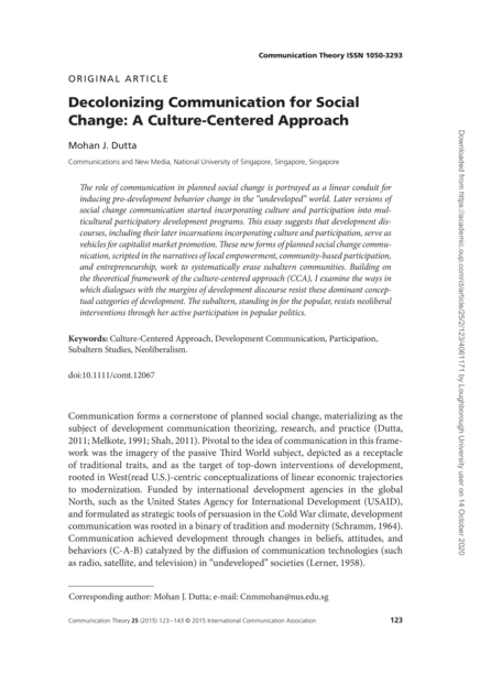 "The role of communication in planned social change is portrayed as a linear conduit for inducing pro-development behavior change in the "undeveloped" world. Later versions of social change communication started incorporating culture and participation into multicultural participatory development programs. This essay suggests that development discourses, including their later incarnations incorporating culture and participation, serve as vehicles for capitalist market promotion. These new forms of planned social change communication, scripted in the narratives of local empowerment, community-based participation, and entrepreneurship, work to systematically erase subaltern communities. Building on the theoretical framework of the culture-Centered approach (CCA), I examine the ways in which dialogues with the margins of development discourse resist these dominant conceptual categories of development. The subaltern, standing in for the popular, resists neoliberal interventions through her active participation in popular politics." (Abstract)