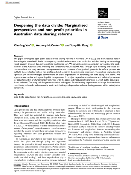 "This paper investigates open public data and data sharing reforms in Australia (2018–2022) and their potential role in deepening the ‘data divide’. In the contemporary datafied welfare state, open public data and data sharing are increasingly vexed issues in times of data-driven artificial intelligence (AI). We scrutinise public consultation surrounding the establishment of the Australian Data Availability and Transparency Act 2022 (DAT Act). Through topic modelling and critical discourse analysis, the study examines the representation and concerns of marginalised groups in the reform process. We highlight the overlooked role of non-profits and civil society in the public data ecosystem. The analysis emphasises the significant yet unacknowledged contributions of these organisations in advocating for data equity and justice. We argue that responsible and equitable public data practices do not just depend on administrative and technical procedures for data sharing but are fundamentally entwined with the social and institutional hierarchies in which public data is produced and used. The study calls for greater inclusion and support for civil society organisations to bridge the data divide, contributing to broader debates on the merits and challenges of open data and data sharing practices within a data justice framework." (Abstract)