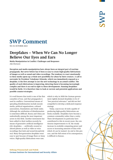 "Deception and media manipulation have always been an integral part of wartime propaganda. But never before has it been so easy to create high-quality fabrications of images as well as sound and video recordings. The tendency to react emotionally to these media opens up a whole new possibility for abuse by their creators. A call to surrender by President Volodymyr Zelensky, which was immediately exposed as a deepfake, is the first attempt to use the new technology in an armed conflict. The quality of such fabrications is improving, detecting them is becoming increasingly complex and there is no end in sight to these developments. Banning deepfakes would be futile. It is therefore time to look at current and potential applications and possible counter-strategies." (Page 1)