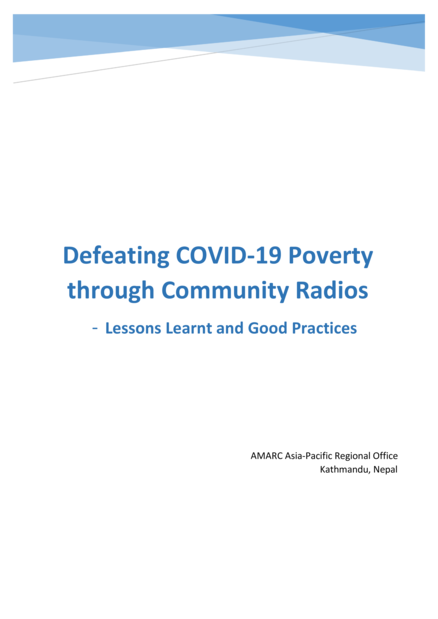 "The project Promotion of Resilient Communities: Addressing COVID-19-related Poverty by Community Radios in South and Southeast Asia was implemented by the World Association of Radio Broadcasters (AMARC) Asia-Pacific regional office to support community radios in four countries - Bangladesh, India, Indonesia and Nepal - in producing programmes that serve as an “emergency response” to help the most marginalised and needy people in the local communities, who have been impacted by the pandemic. In all four countries included in the project, the lockdowns deprived the poorest sections of the population - such as migrant workers and day labourers - of their livelihoods. The people in the rural and especially the hard-to-reach regions are hardly noticed in the public discourse, and some are completely cut off from the general flow of information due to technical, financial and/or language barriers. In contrast, community radios have key characteristics that make them stand out: they are perceived as a trusted part of the community, and their programmes are mostly produced in partnership with and with the participation of community members. 32 community radio journalists from 16 community radios in four countries participated in the training workshops that were organized early this year. There were eight participants from four radio stations in Bangladesh – Radio Jhenuk, Radio Mahananda, Radio Sarabela and Radio Sagorgiri, six participants from three radio stations in India – Gurgaon ki Awaaz, Radio Benziger, and Saiyere Jo Radio, six participants from three radio stations in Indonesia – Lintas Merapi FM, Pass FM, and Rasi FM and two from the community radio association of Indonesia, JRKI and 10 participants from five radio stations in Nepal – Radio Dhading, Radio Parasi, Radio Rudraksha, Radio Sindhu and Radio Udayapur. This publication is a document that summarizes the training workshop sessions and serves as reference/training material for not just the participant radios but the member radios of the association." (Executive summary, page 2)