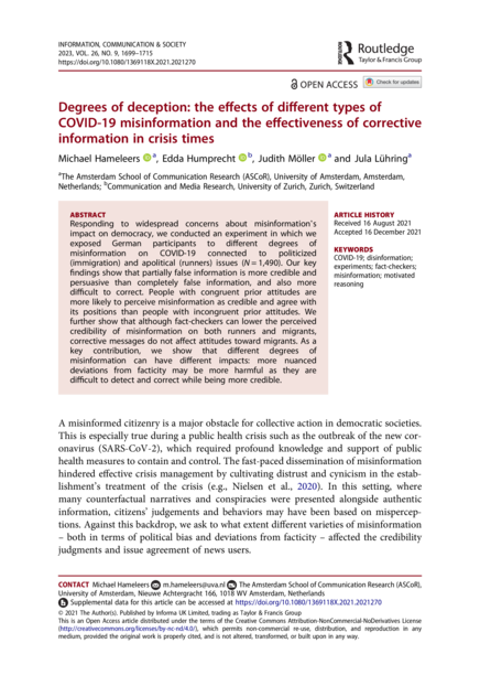 "Responding to widespread concerns about misinformation’s impact on democracy, we conducted an experiment in which we exposed German participants to different degrees of misinformation on COVID-19 connected to politicized (immigration) and apolitical (runners) issues (N = 1,490). Our key findings show that partially false information is more credible and persuasive than completely false information, and also more difficult to correct. People with congruent prior attitudes are more likely to perceive misinformation as credible and agree with its positions than people with incongruent prior attitudes. We further show that although fact-checkers can lower the perceived credibility of misinformation on both runners and migrants, corrective messages do not affect attitudes toward migrants. As a key contribution, we show that different degrees of misinformation can have different impacts: more nuanced deviations from facticity may be more harmful as they are difficult to detect and correct while being more credible." (Abstract)
