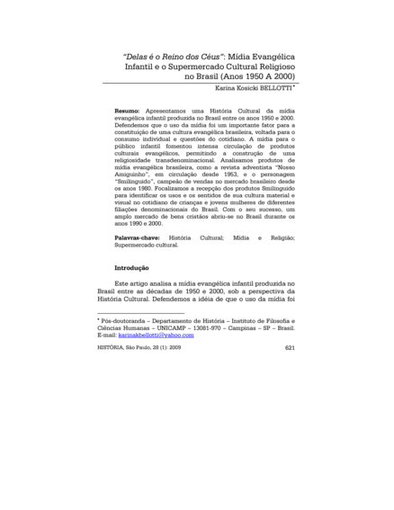 "Apresentamos uma história cultural da mídia evangélica infantil produzida no Brasil entre os anos 1950 e 2000. Defendemos que o uso da mídia foi um importante fator para a constituição de uma cultura evangélica brasileira, voltada para o consumo individual e questões do cotidiano. A mídia para o público infantil fomentou intensa circulação de produtos culturais evangélicos, permitindo a construção de uma religiosidade transdenominacional. Analisamos produtos de mídia evangélica brasileira, como a revista adventista “Nosso Amiguinho”, em circulação desde 1953, e o personagem “Smilinguido”, campeão de vendas no mercado brasileiro desde os anos 1980. Focalizamos a recepção dos produtos Smilinguido para identificar os usos e os sentidos de sua cultura material e visual no cotidiano de crianças e jovens mulheres de diferentes filiações denominacionais do Brasil. Com o seu sucesso, um amplo mercado de bens cristãos abriu-se no Brasil durante os anos 1990 e 2000." (Resumo)