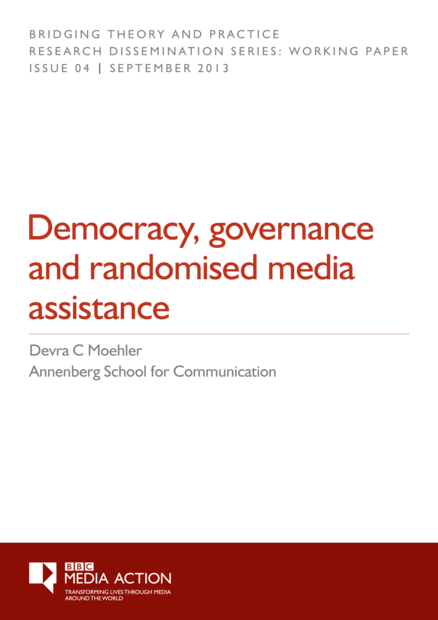 "This paper focuses attention on randomised field experiments in the developing world that explicitly address the use of media to achieve democracy and governance (DG) outcomes [...] The first section describes the growth of DG assistance and the increasing interest in DG field experiments. The second section describes the domain of media assistance targeted at DG outcomes. The third provides an overview of current experimental and quasi-experimental studies on the intersection between media, democracy and governance. The fourth and fifth sections describe some of the challenges to successfully employing field experiments to inform media assistance programmes. The final section concludes by arguing for the benefits of practitioner-academic collaborations that provide experimental evidence about the influences on as well as the effects of media content related to democracy and governance." (Page 4)
