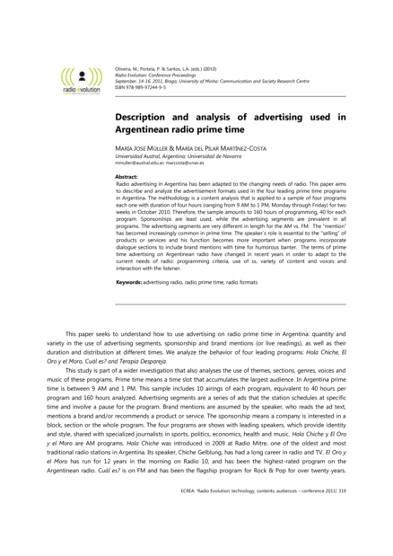 "Radio advertising in Argentina has been adapted to the changing needs of radio. This paper aims to describe and analyze the advertisement formats used in the four leading prime time programs in Argentina. The methodology is a content analysis that is applied to a sample of four programs each one with duration of four hours (ranging from 9 AM to 1 PM, Monday through Friday) for two weeks in October 2010. Therefore, the sample amounts to 160 hours of programming, 40 for each program. Sponsorships are least used, while the advertising segments are prevalent in all programs. The advertising segments are very different in length for the AM vs. FM. The “mention” has becomed increasingly common in prime time. The speaker´s role is essential to the "selling” of products or services and his function becomes more important when programs incorporate dialogue sections to include brand mentions with time for humorous banter. The terms of prime time advertising on Argentinean radio have changed in recent years in order to adapt to the current needs of radio: programming criteria, use of ss, variety of content and voices and interaction with the listener." (Abstract)