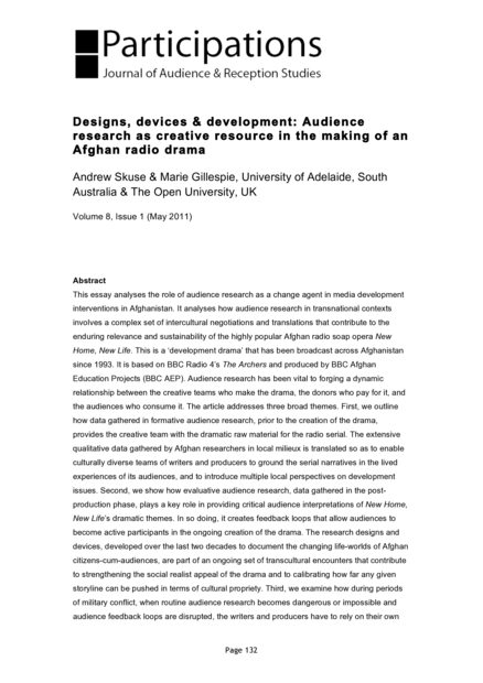 "This essay analyses the role of audience research as a change agent in media development interventions in Afghanistan. It analyses how audience research in transnational contexts involves a complex set of intercultural negotiations and translations that contribute to the enduring relevance and sustainability of the highly popular Afghan radio soap opera New Home, New Life. This is a ‘development drama’ that has been broadcast across Afghanistan since 1993. It is based on BBC Radio 4’s The Archers and produced by BBC Afghan Education Projects (BBC AEP). Audience research has been vital to forging a dynamic relationship between the creative teams who make the drama, the donors who pay for it, and the audiences who consume it. The article addresses three broad themes. First, we outline how data gathered in formative audience research, prior to the creation of the drama, provides the creative team with the dramatic raw material for the radio serial. The extensive qualitative data gathered by Afghan researchers in local milieux is translated so as to enable culturally diverse teams of writers and producers to ground the serial narratives in the lived experiences of its audiences, and to introduce multiple local perspectives on development issues. Second, we show how evaluative audience research, data gathered in the postproduction phase, plays a key role in providing critical audience interpretations of New Home, New Life’s dramatic themes. In so doing, it creates feedback loops that allow audiences to become active participants in the ongoing creation of the drama. The research designs and devices, developed over the last two decades to document the changing life-worlds of Afghan citizens-cum-audiences, are part of an ongoing set of transcultural encounters that contribute to strengthening the social realist appeal of the drama and to calibrating how far any given storyline can be pushed in terms of cultural propriety. Third, we examine how during periods of military conflict, when routine audience research becomes dangerous or impossible and audience feedback loops are disrupted, the writers and producers have to rely on their own personal and political experiences, often with unpredictable ideological consequences. We draw attention to the limitations and challenges of making dramas for development in highly charged politicised and postcolonial contexts. While, development dramas may be a cheap and effective way of dealing with certain informational needs, such as landmine awareness, they cannot redress social and structural inequalities or, as Western donors wish, eradicate opium cultivation." (Abstract)