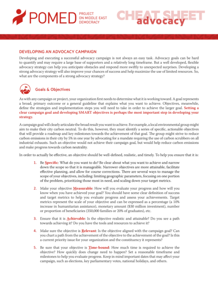 "Developing and executing a successful advocacy campaign is not always an easy task. Advocacy goals can be hard to quantify and may require a large base of supporters and a relatively long timeframe. But a well developed, flexible advocacy strategy can help you anticipate obstacles and respond more swiftly to unexpected surprises. Developing a strong advocacy strategy will also improve your chances of success and help maximize the use of limited resources. So, what are the components of a strong advocacy strategy?" (Introduction)