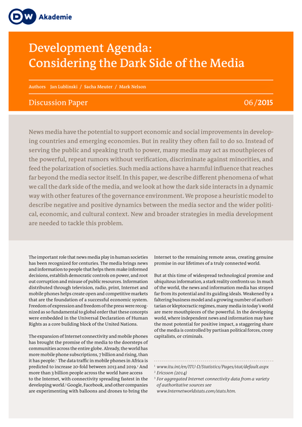 "Instead of serving the public and speaking truth to power, many media may act as mouthpieces of the powerful, repeat rumors without verification, discriminate against minorities, and feed the polarization of societies. Such media actions have a harmful influence that reaches far beyond the media sector itself. In this paper, we describe different phenomena of what we call the dark side of the media, and we look at how the dark side interacts in a dynamic way with other features of the governance environment. We propose a heuristic model to describe negative and positive dynamics between the media sector and the wider political, economic, and cultural context. New and broader strategies in media development are needed to tackle this problem." (Page 1)