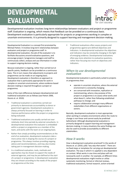 "Developmental evaluation involves long-term relationships between evaluators and project or programme staff. Evaluation is ongoing, which means that feedback can be provided on a continuous basis. Development evaluation is particularly appropriate for projects or programmes working in complex or uncertain environments. It is primarily designed to support learning and management decision-making." (Introduction)