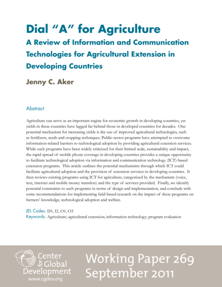 "This article outlines the potential mechanisms through which ICT could facilitate agricultural adoption and the provision of extension services in developing countries. It then reviews existing programs using ICT for agriculture, categorized by the mechanism (voice, text, internet and mobile money transfers) and the type of services provided. Finally, we identify potential constraints to such programs in terms of design and implementation, and conclude with some recommendations for implementing field-based research on the impact of these programs on farmers’ knowledge, technological adoption and welfare." (Abstract)