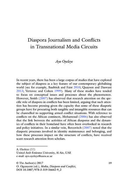 "This chapter has focussed attention on recognising the specifc category of diaspora journalism as one of the key dimensions of diaspora formations and their ability to intervene in international politics in general and in conficts relating to their countries of origin in particular. We contend that diaspora journalism should be understood both as the more formal forms of news activities that replicate the structure, practices and professional ethos of mainstream journalism as well as the less formalised but no less potent journalistic practices of individual or collective diasporans across the world." (Conclusion, page 33)