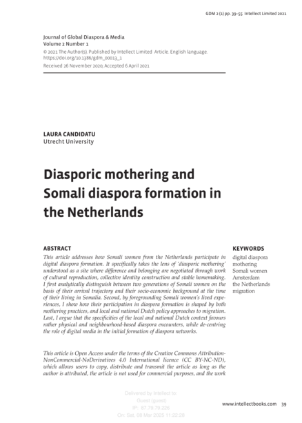 "This article addresses how Somali women from the Netherlands participate in digital diaspora formation. It specifically takes the lens of ‘diasporic mothering’ understood as a site where difference and belonging are negotiated through work of cultural reproduction, collective identity construction and stable homemaking. I first analytically distinguish between two generations of Somali women on the basis of their arrival trajectory and their socio-economic background at the time of their living in Somalia. Second, by foregrounding Somali women’s lived experiences, I show how their participation in diaspora formation is shaped by both mothering practices, and local and national Dutch policy approaches to migration. Last, I argue that the specificities of the local and national Dutch context favours rather physical and neighbourhood-based diaspora encounters, while de-centring the role of digital media in the initial formation of diaspora networks." (Abstract)