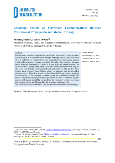 "Der sogenannte Islamische Staat nutzt in seiner Kommunikationsstrategie vor allem eine Form von direkter Zielgruppenansprache über eigens produzierte Videos und Nachrichtenkanäle. Die Verwendung von massenmedialen Multiplikatoren ist zwar weiterhin ein wichtiger Bestandteil zur Verbreitung von Angst, die der Terrorismus evozieren will; allerdings eröffnet diese Möglichkeit der direkten Kommunikation eine völlig neue Ansprache der Rezipienten. Bei der Verbreitung über traditionelle Massenmedien muss seitens der Terroristen eine ausgleichende Berichterstattung in Kauf genommen werden – das klassische Medien-Framing. Dagegen können bei direkter Ansprache relevanter Publika strategische Kommunikator-Frames und Narrative gesetzt werden. Über die Wirkung von Propaganda wird nach wie vor debattiert. Daher stellt sich die Frage, ob diese Botschaften grundlegend anders auf Rezipienten wirken als Medienberichte, in denen ebenfalls ideologische Botschaften kommuniziert werden. Im vorliegenden Beitrag wird in einem experimentellen Design die Wirkung terroristischer Kommunikationsinhalte auf die Emotionen der Rezipienten untersucht. Die Ergebnisse zeigen unter anderem, dass strategische Kommunikator-Frames negative Emotionen verstärken können. Politisches Wissen und Themeninteresse können jedoch diese Reaktionen und damit die Hauptwirkungskomponente des Terrorismus – die Angst – reduzieren." (Abstract)