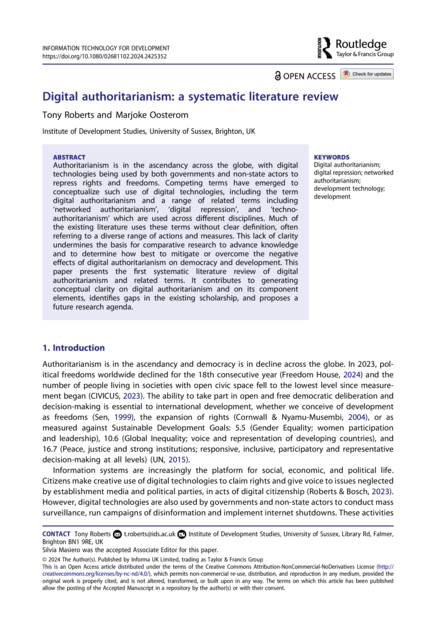 "Authoritarianism is in the ascendancy across the globe, with digital technologies being used by both governments and non-state actors to repress rights and freedoms. Competing terms have emerged to conceptualize such use of digital technologies, including the term digital authoritarianism and a range of related terms including ‘networked authoritarianism’, ‘digital repression’, and ‘technoauthoritarianism’ which are used across different disciplines. Much of the existing literature uses these terms without clear definition, often referring to a diverse range of actions and measures. This lack of clarity undermines the basis for comparative research to advance knowledge and to determine how best to mitigate or overcome the negative effects of digital authoritarianism on democracy and development. This paper presents the first systematic literature review of digital authoritarianism and related terms. It contributes to generating conceptual clarity on digital authoritarianism and on its component elements, identifies gaps in the existing scholarship, and proposes a future research agenda." (Abstract)