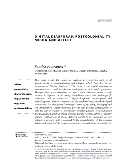 "This essay revisits the notion of diaspora in connection with recent advancements in communication technologies, which have led to the formation of 'digital diasporas'. The focus is on digital migrants as 'connected users', and therefore as participants in social media platforms. Though there is no consensus on what digital diaspora means exactly because it depends on its many disciplinary takes and media-specific variations, such as 'e-diasporas', 'digital diasporas', 'net-diasporas' and 'web-diasporas', there is consensus on the profound ways in which digital connectivity has transformed privileged terms of spatiality, belonging and self-identification. Digital diasporas provide new possible cartographies to map the self in relation to increasingly complex patterns of globalization and localization, while avoiding closures and the negative effects of identity politics. Furthermore, it allows different scripts to be envisioned for the politics of emotion that is essential to the understanding of the motives, nature and impact of the migrant experience, as well as the possibility for negotiating multiple belongings. The essay reviews some of the disciplinary or media-specific takes that have emerged from science and technology studies, media, communication studies and migration studies, anthropology and sociology. Offering a postcolonial intervention into this interdisciplinary field, the essay analyses 'digital diaspora' as a relational term that operates on three levels - Internet-specific, network-oriented and embedded in wider social practices - while also accounting for political, geographical and historical specificities." (Abstract)