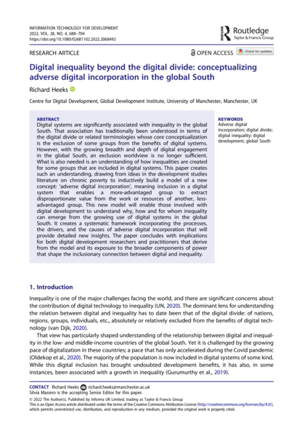 "Digital systems are significantly associated with inequality in the global South. That association has traditionally been understood in terms of the digital divide or related terminologies whose core conceptualization is the exclusion of some groups from the benefits of digital systems. However, with the growing breadth and depth of digital engagement in the global South, an exclusion worldview is no longer sufficient. What is also needed is an understanding of how inequalities are created for some groups that are included in digital systems. This paper creates such an understanding, drawing from ideas in the development studies literature on chronic poverty to inductively build a model of a new concept: ‘adverse digital incorporation’, meaning inclusion in a digital system that enables a more-advantaged group to extract disproportionate value from the work or resources of another, less advantaged group. This new model will enable those involved with digital development to understand why, how and for whom inequality can emerge from the growing use of digital systems in the global South. It creates a systematic framework incorporating the processes, the drivers, and the causes of adverse digital incorporation that will provide detailed new insights. The paper concludes with implications for both digital development researchers and practitioners that derive from the model and its exposure to the broader components of power that shape the inclusionary connection between digital and inequality." (Abstract)