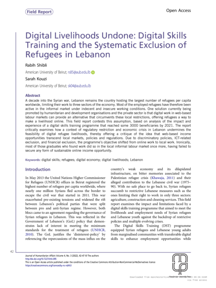 "A decade into the Syrian war, Lebanon remains the country hosting the largest number of refugees per capita worldwide, limiting their work to three sectors of the economy. Most of the employed refugees have therefore been active in the informal market under indecent and insecure working conditions. One solution currently being promoted by humanitarian and development organisations and the private sector is that digital work in web-based labour markets can provide an alternative that circumvents these local restrictions, offering refugees a way to make a livelihood online. This field report contests this assumption, based on analysis of the impact and experience of a digital skills training programme that reached some 3000 beneficiaries by 2021. The report critically examines how a context of regulatory restriction and economic crisis in Lebanon undermines the feasibility of digital refugee livelihoods, thereby offering a critique of the idea that web-based income opportunities transcend local markets, policies and regulations. Due to discriminatory policies, ICT-related exclusion, and financial exclusion, the programme’s objective shifted from online work to local work. Ironically, most of those graduates who found work did so in the local informal labour market once more, having failed to secure any form of sustainable online income opportunity." (Abstract)