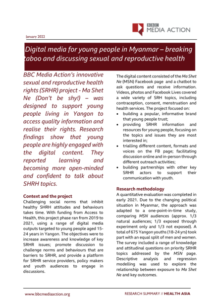 "BBC Media Action’s innovative sexual and reproductive health rights (SRHR) project - Ma Shet Ne (Don’t be shy!) – was designed to support young people living in Yangon to access quality information and realise their rights. Research findings show that young people are highly engaged with the digital content. They reported learning and becoming more open-minded and confident to talk about SHRH topics." (Page 1)