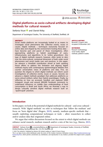 "Social media platforms are increasingly looked at as means to investigate social phenomena like collective events, issues or causes. Digital methods – techniques exclusively focused on online data and shaped by the environment hosting these data – have become part and parcel of these investigations, often approaching platforms as hybrid assemblages of users, infrastructures, and algorithms. In its ‘online groundness’, this type of digital methods research, however, often tends to skim over the socio-cultural, contextual dimension of both wider social phenomena and social media uses and practices. In this paper, we advance a threefold contribution aimed at both sparking future efforts to address this limitation and aligning digital methods inquiry with contemporary epistemological debates that counter universalistic views of platforms and data. First, we question the degree to which digital methods can inform social investigations of collective events, issues or causes. Second, we advance a digital methods paradigm that addresses platforms as socio-cultural artifacts rather than hybrid assemblages. Finally, by reflecting on how we accessed, handled, and explored 9,000 Instagram visuals and around 400,000 Facebook comments to understand influences on middle class understandings of food consumption in Brazil and South Africa, we illustrate a way to design culturally sensitive digital methods research built on ‘quanti-quali’ practices." (Abstract)