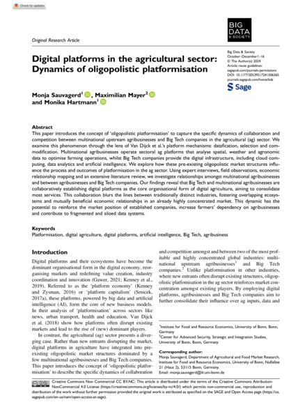 "This paper introduces the concept of ‘oligopolistic platformisation’ to capture the specific dynamics of collaboration and competition between multinational upstream agribusinesses and Big Tech companies in the agricultural (ag) sector. We examine this phenomenon through the lens of Van Dijck et al.’s platform mechanisms: datafication, selection and commodification. Multinational agribusinesses operate sectoral ag platforms that analyse spatial, weather and agronomic data to optimise farming operations, whilst Big Tech companies provide the digital infrastructure, including cloud computing, data analytics and artificial intelligence. We explore how these pre-existing oligopolistic market structures influence the process and outcomes of platformisation in the ag sector. Using expert interviews, field observations, economic relationship mapping and an extensive literature review, we investigate relationships amongst multinational agribusinesses and between agribusinesses and Big Tech companies. Our findings reveal that Big Tech and multinational agribusinesses are collaboratively establishing digital platforms as the core organisational form of digital agriculture, aiming to consolidate most services. This collaboration blurs the lines between traditionally distinct industries, fostering overlapping ecosystems and mutually beneficial economic relationships in an already highly concentrated market. This dynamic has the potential to reinforce the market position of established companies, increase farmers’ dependency on agribusinesses and contribute to fragmented and siloed data systems." (Abstract)