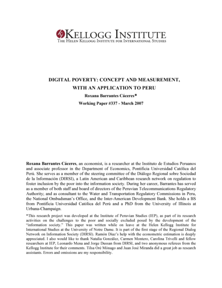 "This paper discusses the notions of demand, poverty, information needs, and information and communication technologies (ICTs) to offer a concept of digital poverty, which may be useful to estimate the digital poverty level in Latin America and the Caribbean. The paper is composed of two sections. The first section contains a conceptual discussion of digital poverty, its types and possible levels, and the underlying economic foundations. ICTs are defined based on their use and the conditions for such use. Digital poverty is therefore defined as a lack of ICTs and might be a feature of any population segment, whether or not economically poor. The second section of this paper is an empirical attempt to validate the classification, using data from a household survey (ENAHO) carried out in Peru. The limitations in measuring digital poverty at the household level instead of at the individual level are acknowledged. Lastly, the conclusions reached, possible implications for public policy, and the avenues open for further research are presented." (Abstract)