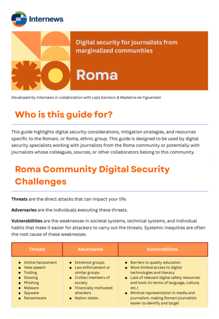 "This guide highlights digital security considerations, mitigation strategies, and resources specific to the Romani, or Roma, ethnic group. This guide is designed to be used by digital security specialists working with journalists from the Roma community or potentially with journalists whose colleagues, sources, or other collaborators belong to this community." (Page 1)