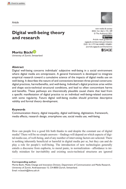 "Digital well-being concerns individuals’ subjective well-being in a social environment where digital media are omnipresent. A general framework is developed to integrate empirical research toward a cumulative science of the impacts of digital media use on well-being. It describes the nature of and connections between three pivotal constructs: digital practices, harms/benefits, and well-being. Individual’s digital practices arise within and shape socio-technical structural conditions, and lead to often concomitant harms and benefits. These pathways are theoretically plausible causal chains that lead from a specific manifestation of digital practice to an individual well-being-related outcome with some regularity. Future digital well-being studies should prioritize descriptive validity and formal theory development." (Abstract)