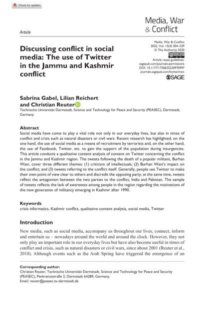 "This article conducts a qualitative content analysis of content on Twitter concerning the conflict in the Jammu and Kashmir region. The tweets following the death of a popular militant, Burhan Wani, cover three different themes: (1) criticism of intellectuals; (2) Burhan Wani’s impact on the conflict; and (3) tweets referring to the conflict itself. Generally, people use Twitter to make their own point of view clear to others and discredit the opposing party; at the same time, tweets reflect the antagonism between the two parties to the conflict, India and Pakistan. The sample of tweets reflects the lack of awareness among people in the region regarding the motivations of the new generation of militancy emerging in Kashmir after 1990." (Abstract)