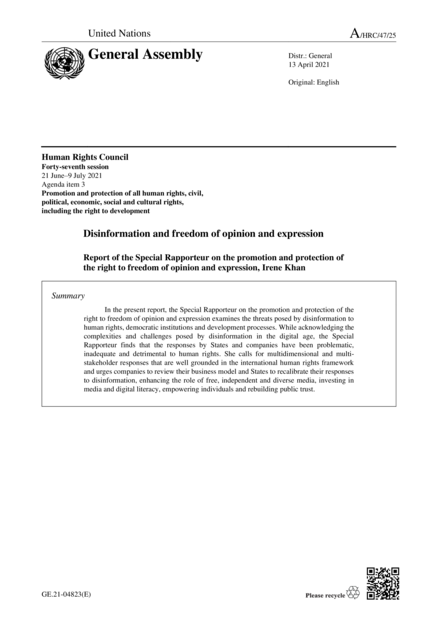 "In the present report, the Special Rapporteur on the promotion and protection of the right to freedom of opinion and expression examines the threats posed by disinformation to human rights, democratic institutions and development processes. While acknowledging the complexities and challenges posed by disinformation in the digital age, the Special Rapporteur finds that the responses by States and companies have been problematic, inadequate and detrimental to human rights. She calls for multidimensional and multi-stakeholder responses that are well grounded in the international human rights framework and urges companies to review their business model and States to recalibrate their responses to disinformation, enhancing the role of free, independent and diverse media, investing in media and digital literacy, empowering individuals and rebuilding public trust." (Summary)