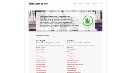 "Das DiskursGlossar ist ein Online-Lexikon zur strategischen Kommunikation. Auf Basis aktueller Forschung bietet es kompakte und anschauliche Informationen zu Phänomenen diskursiver Kämpfe, wie wir sie in Medien, Politik, Recht und Zivilgesellschaft beobachten können. Das Glossar soll dazu beitragen, kommunikative Strategien in der öffentlichen Praxis besser zu erkennen, zu bezeichnen und zu kritisieren." (diskursmonitor.de/glossar)