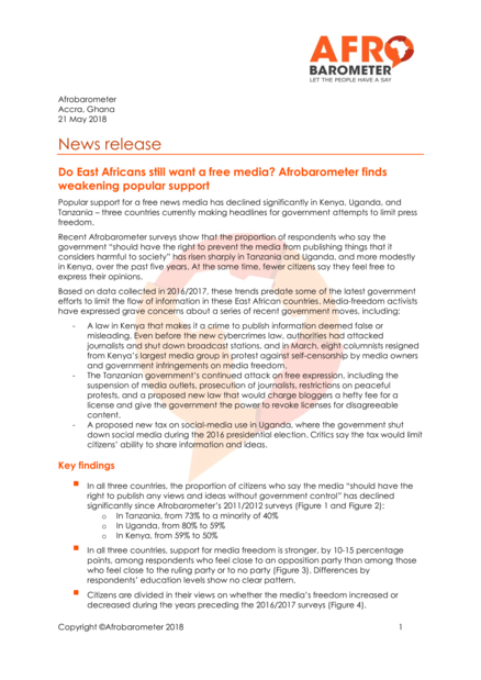 "Popular support for a free news media has declined significantly in Kenya, Uganda, and Tanzania – three countries currently making headlines for government attempts to limit press freedom. Recent Afrobarometer surveys show that the proportion of respondents who say the government “should have the right to prevent the media from publishing things that it considers harmful to society” has risen sharply in Tanzania and Uganda, and more modestly in Kenya, over the past five years. At the same time, fewer citizens say they feel free to express their opinions." (Page 1)