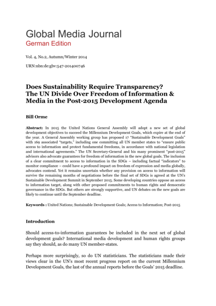 Does Sustainability Require Transparency? The UN Divide Over Freedom of Information and Media in the Post-2015 Development Agenda