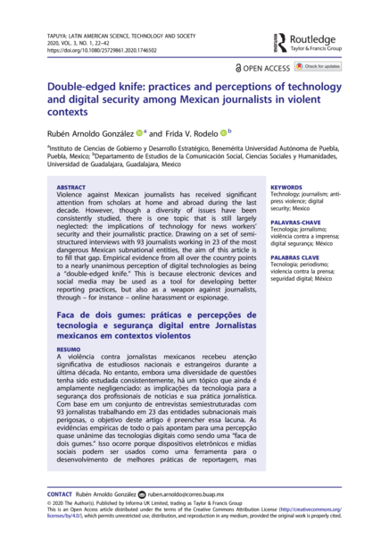 "Violence against Mexican journalists has received significant attention from scholars at home and abroad during the last decade. However, though a diversity of issues have been consistently studied, there is one topic that is still largely neglected: the implications of technology for news workers’ security and their journalistic practice. Drawing on a set of semi-structured interviews with 93 journalists working in 23 of the most dangerous Mexican subnational entities, the aim of this article is to fill that gap. Empirical evidence from all over the country points to a nearly unanimous perception of digital technologies as being a “double-edged knife.” This is because electronic devices and social media may be used as a tool for developing better reporting practices, but also as a weapon against journalists, through – for instance – online harassment or espionage." (Abstract)