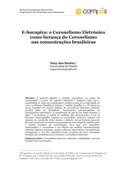 "É possível adaptar o conceito coronelismo ao campo da comunicação a partir do adendo “eletrônico”? Podemos dizer que a propriedade de meios de comunicação é similar ao que foi a propriedade da terra na Primeira República? Seriam o “radinho de pilha” e a TV aberta as novas enxadas? Se estamos falando de coronelismo eletrônico, podemos também falar de clientelismo, mandonismo, patrimonialismo ou municipalismo eletrônicos? A consideração de que há um limite histórico a datar o coronelismo se reflete no ambiente das comunicações? Á luz da literatura historiográfica relativa ao coronelismo, tentamos resgatar um conjunto de enunciados deste sistema e defender sua pertinência enquanto herança conceitual conveniente à proposição de uma categoria analítica para o modelo brasileiro de comunicações. Para isso, será necessário: contextualizar o coronelismo e sua adoção nas análises comunicacionais, delimitar algumas fronteiras, apontar algumas imprecisões e inconsistências corriqueiras, e, por fim, especificar nossa proposta de cinco enunciados herdados do coronelismo para constituir o coronelismo eletrônico." (Resumo)