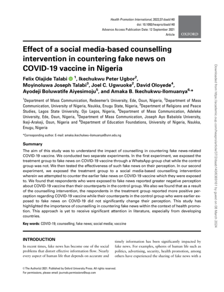 Effect of a social media-based counselling intervention in countering fake news on COVID-19 vaccine in Nigeria