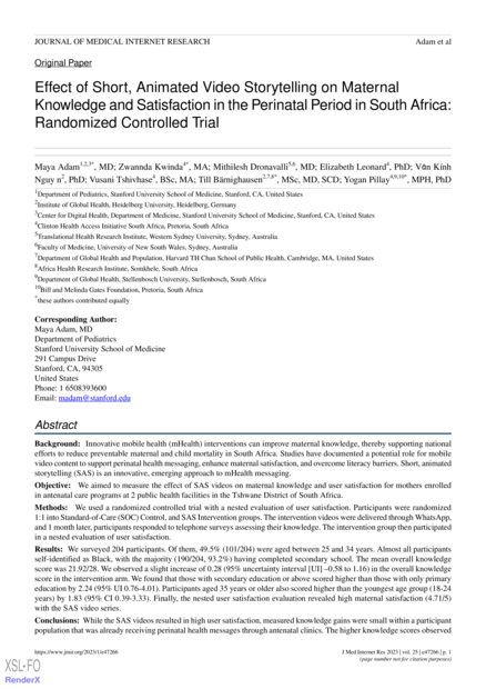 "Innovative mobile health (mHealth) interventions can improve maternal knowledge, thereby supporting national efforts to reduce preventable maternal and child mortality in South Africa. Studies have documented a potential role for mobile video content to support perinatal health messaging, enhance maternal satisfaction, and overcome literacy barriers. Short, animated storytelling (SAS) is an innovative, emerging approach to mHealth messaging. Objective: We aimed to measure the effect of SAS videos on maternal knowledge and user satisfaction for mothers enrolled in antenatal care programs at 2 public health facilities in the Tshwane District of South Africa. Methods: We used a randomized controlled trial with a nested evaluation of user satisfaction. Participants were randomized 1:1 into Standard-of-Care (SOC) Control, and SAS Intervention groups. The intervention videos were delivered through WhatsApp, and 1 month later, participants responded to telephone surveys assessing their knowledge. The intervention group then participated in a nested evaluation of user satisfaction [...] Conclusions: While the SAS videos resulted in high user satisfaction, measured knowledge gains were small within a participant population that was already receiving perinatal health messages through antenatal clinics. The higher knowledge scores observed in older participants with higher education levels suggest that boosting maternal knowledge in younger mothers with lower education levels should continue to be a public health priority in South Africa. Given the high maternal satisfaction among the SAS video-users in this study, policy makers should consider integrating similar approaches into existing, broad-reaching perinatal health programs, such as MomConnect, to boost satisfaction and potentially enhance maternal engagement. While previous studies have shown the promise of animated video health education, most of this research has been conducted in high-income countries. More research in underresourced settings is urgently needed, especially as access to mobile technology increases in the Global South. Future studies should explore the effect of SAS videos on maternal knowledge in hard-to-reach populations with limited access to antenatal care, although real-world logistical challenges persist when implementing studies in underresourced South African populations." (Abstract)