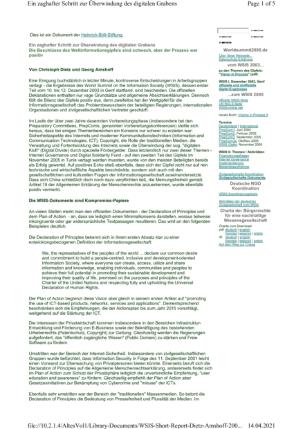 "Eine Einigung buchstäblich in letzter Minute, kontroverse Entscheidungen in Arbeitsgruppen vertagt - die Ergebnisse des World Summit on the Information Society (WSIS), dessen erster Teil vom 10. bis 12. Dezember 2003 in Genf stattfand, sind bescheiden. Die offiziellen Deklarationen enthalten nur vage Grundsätze und allgemeine Absichtserklärungen. Dennoch fällt die Bilanz des Gipfels positiv aus, denn zweifellos hat der Weltgipfel für die Informationsgesellschaft das Problembewusstsein der beteiligten Regierungen, internationalen Organisationen und zivilgesellschaftlichen Vertreter geschärft." (Seite 720)