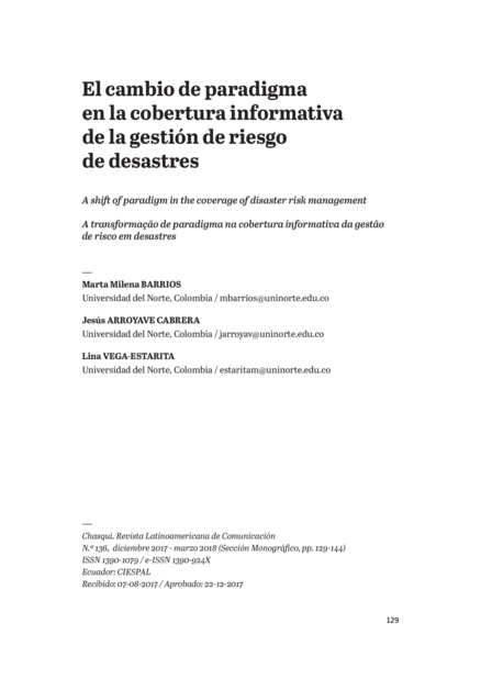 "Este artículo analizó la cobertura de la gestión de riesgo de desastres en tres regiones de América Latina para conocer si el cambio de paradigma, de pensar el riesgo como una construcción social en lugar de enfocarse en el desastre, se veía reflejado en las narrativas periodísticas. Mediante un análisis de contenido de 130 noticias se demostró que la redacción presenta vicios como privilegiar fuentes oficiales y comunicados de prensa o contar los hechos sin análisis ni contexto. Se evidenció que el énfasis permanece en el desastre, lo que representa una oportunidad de ejercer un periodismo de prevención, que presente la GRD como un tema transversal en la agenda mediática, alineada con temas del desarrollo como pobreza, corrupción o salud." (Resumen)
