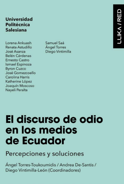 "En un mundo globalizado donde la información fluye, los medios de comunicación tienen un papel esencial en moldear opiniones y actitudes. En El discurso de odio en los medios de Ecuador: percepciones y soluciones, estudiantes del sexto ciclo de Comunicación en la Universidad Politécnica Salesiana, sede Cuenca, abordan un tema de gran relevancia en nuestra sociedad actual. Utilizando su formación académica como base enriquecedora, estos jóvenes investigadores exploran el fenómeno del discurso de odio en los medios de comunicación ecuatorianos. A través de estudios de caso y análisis críticos rigurosos, examinan cómo ciertas expresiones mediáticas pueden perpetuar estereotipos dañinos, promover la división y socavar los pilares de una sociedad diversa y plural. Este libro no solo arroja luz sobre los desafíos que enfrenta nuestra sociedad respecto al discurso de odio, sino que también destaca la importancia de una comunicación responsable y ética mediante propuestas para mitigar la misoginia, homofobia, racismo, xenofobia y disablismo en los medios de comunicación en el contexto ecuatoriano." (Descripción de la casa editorial)