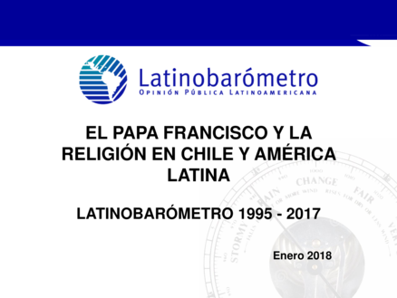"Presentamos la evolución de la religión en Chile y en América Latina entre 1995 y 2017 con ocasión de la visita del Papa Francisco a Chile. Se observan grandes cambios en la cantidad de ciudadanos que declaran pertenecer a una religión u otra. En 2017 hay siete países de la región donde la religión católica no es dominante, en 2013 eran cuatro. Chile destaca por la fuerte caída del catolicismo y el fuerte aumento de los que no declaran tener ninguna religión, son agnósticos o ateos. Es un caso de secularización acelerada. El impacto del caso Karadima en Chile queda plasmado en la caída de los que se declaran católicos y la práctica religiosa. Al mismo tiempo se observa un repunte del catolicismo con la llegada del Papa Francisco en 2013. La pregunta que está en el aire es si acaso el liderazgo del Pontífice puede producir una recuperación del catolicismo en América Latina y en Chile." (Resumen ejecutivo)
