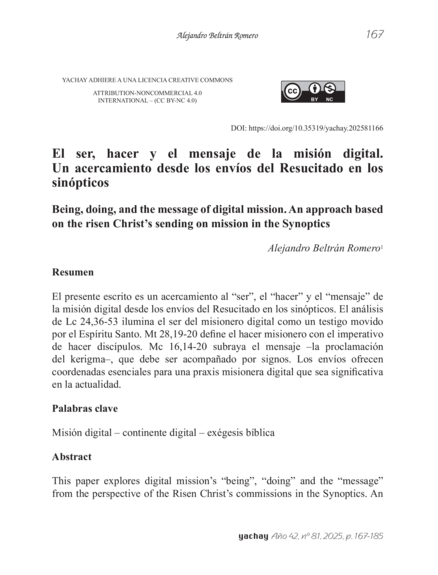 "El presente escrito es un acercamiento al “ser”, el “hacer” y el “mensaje” de la misión digital desde los envíos del Resucitado en los sinópticos. El análisis de Lc 24,36-53 ilumina el ser del misionero digital como un testigo movido por el Espíritu Santo. Mt 28,19-20 define el hacer misionero con el imperativo de hacer discípulos. Mc 16,14-20 subraya el mensaje –la proclamación del kerigma–, que debe ser acompañado por signos. Los envíos ofrecen coordenadas esenciales para una praxis misionera digital que sea significativa en la actualidad." (Resumen)