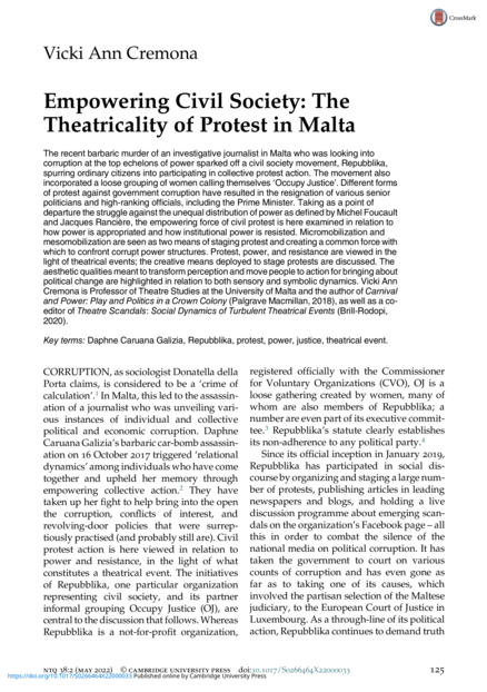 "The recent barbaric murder of an investigative journalist in Malta who was looking into corruption at the top echelons of power sparked off a civil society movement, Repubblika, spurring ordinary citizens into participating in collective protest action. The movement also incorporated a loose grouping of women calling themselves ‘Occupy Justice’. Different forms of protest against government corruption have resulted in the resignation of various senior politicians and high-ranking officials, including the Prime Minister. Taking as a point of departure the struggle against the unequal distribution of power as defined by Michel Foucault and Jacques Rancière, the empowering force of civil protest is here examined in relation to how power is appropriated and how institutional power is resisted. Micromobilization and mesomobilization are seen as two means of staging protest and creating a common force with which to confront corrupt power structures. Protest, power, and resistance are viewed in the light of theatrical events; the creative means deployed to stage protests are discussed. The aesthetic qualities meant to transform perception and move people to action for bringing about political change are highlighted in relation to both sensory and symbolic dynamics." (Abstract)