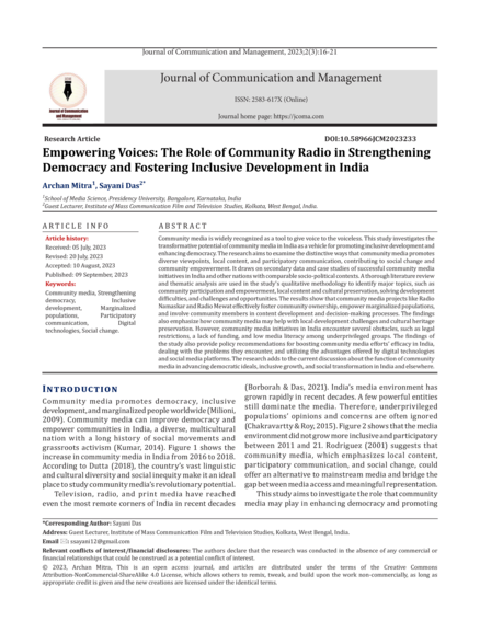 "Community media is widely recognized as a tool to give voice to the voiceless. This study investigates the transformative potential of community media in India as a vehicle for promoting inclusive development and enhancing democracy. The research aims to examine the distinctive ways that community media promotes diverse viewpoints, local content, and participatory communication, contributing to social change and community empowerment. It draws on secondary data and case studies of successful community media initiatives in India and other nations with comparable socio-political contexts. A thorough literature review and thematic analysis are used in the study’s qualitative methodology to identify major topics, such as community participation and empowerment, local content and cultural preservation, solving development difficulties, and challenges and opportunities. The results show that community media projects like Radio Namaskar and Radio Mewat effectively foster community ownership, empower marginalized populations, and involve community members in content development and decision-making processes. The findings also emphasize how community media may help with local development challenges and cultural heritage preservation. However, community media initiatives in India encounter several obstacles, such as legal restrictions, a lack of funding, and low media literacy among underprivileged groups. The findings of the study also provide policy recommendations for boosting community media efforts’ efficacy in India, dealing with the problems they encounter, and utilizing the advantages offered by digital technologies and social media platforms. The research adds to the current discussion about the function of community media in advancing democratic ideals, inclusive growth, and social transformation in India and elsewhere." (Abstract)