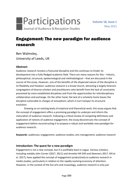 "Audience research remains a fractured discipline and this continues to hinder its development into a fully-fledged academic field. There are many reasons for this – historic, philosophical, structural, epistemological and methodological – that are discussed in the course of this essay. However, one of the benefits of the dispersed nature of the discipline is its flexibility and freedom: audience research is a broad church, attracting a largely itinerant congregation of diverse scholars and practitioners who benefit from the lack of constraints presented by more established disciplines and from the opportunities for interdisciplinary collaboration and exchange. On the other hand, the lack of a scholarly home leaves the discipline vulnerable to charges of amorphism, which in turn hamper its structural evolution. Drawing on an existing body of empirical and theoretical work, this essay argues that the concept of engagement offers a promising paradigm to underpin and inform the maturation of audience research. Following a critical review of competing definitions and application of notions of audience engagement, the essay deconstructs the concept of engagement before reconstructing it to propose a robust and workable new paradigm for audience research." (Abstract)