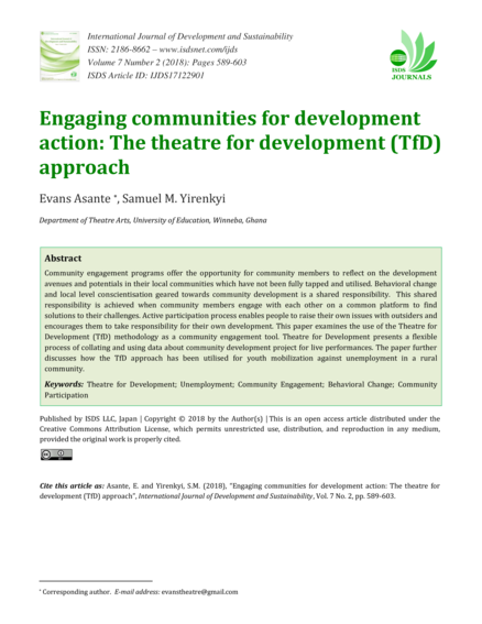 "Community engagement programs offer the opportunity for community members to reflect on the development avenues and potentials in their local communities which have not been fully tapped and utilised. Behavioral change and local level conscientisation geared towards community development is a shared responsibility. This shared responsibility is achieved when community members engage with each other on a common platform to find solutions to their challenges. Active participation process enables people to raise their own issues with outsiders and encourages them to take responsibility for their own development. This paper examines the use of the Theatre for Development (TfD) methodology as a community engagement tool. Theatre for Development presents a flexible process of collating and using data about community development project for live performances. The paper further discusses how the TfD approach has been utilised for youth mobilization against unemployment in a rural community." (Abstract)