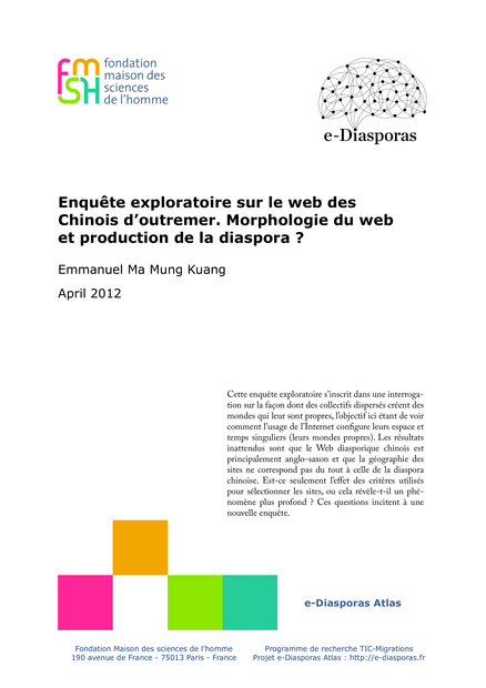 "Cette enquête exploratoire s’inscrit dans une interrogation sur la façon dont des collectifs dispersés créent des mondes qui leur sont propres, l’objectif ici étant de voir comment l’usage de l’Internet configure leurs espace et temps singuliers (leurs mondes propres). Les résultats inattendus sont que le Web diasporique chinois est principalement anglo-saxon et que la géographie des sites ne correspond pas du tout à celle de la diaspora chinoise. Est-ce seulement l’effet des critères utilisés pour sélectionner les sites, ou cela révèle-t-il un phénomène plus profond ? Ces questions incitent à une nouvelle enquête." (Résumé)