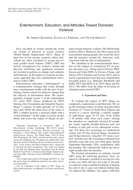 "Entertainment education (“edutainment”) is a communication strategy that works through mass entertainment media with the aim of promoting a better context for behavior change than the delivery of information alone. We experimentally evaluate season 3 of the edutainment TV series MTV Shuga, produced by MTV Staying Alive Foundation and filmed in Nigeria. Shuga 3 consists of eight episodes of 22 minutes each. While the main focus of the series is HIV, a subplot involves a married couple with a violent husband. In this paper we focus on this theme and assess the impact of Shuga on attitudes toward domestic violence. We find broadly positive effects. Moreover, the effect seems to be concentrated among people who recall the show and the narrative around the characters well, consistent with the idea of edutainment. We contribute to the nonexperimental literature on the impact of commercial TV on gender outcomes (e.g., Chong and La Ferrara 2009; Jensen and Oster 2009; La Ferrara, Chong, and Duryea 2012; Kearney and Levine 2015) and to recent experimental work that uses edutainment for public policy (e.g., Banerjee, Barnhardt, and Duflo 2015; Ravallion et al. 2015; Berg and Zia 2017). We differ from the latter in focusing on changing norms toward gender based violence."