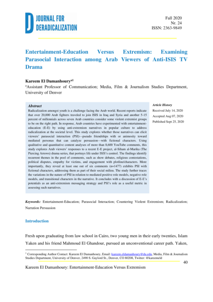 "Recent reports indicate that over 20,000 Arab fighters traveled to join ISIS in Iraq and Syria and another 5-15 percent of millennials across seven Arab countries consider some violent extremist groups to be on the right path. In response, Arab countries have experimented with entertainment-education (E-E) by using anti-extremism narratives in popular culture to address radicalization at the societal level. This study explores whether those narratives can elicit viewers’ parasocial interaction (PSI)—pseudo friendships with or animosity toward mediated personas that can catalyze persuasion—with fictional characters. Using qualitative and quantitative content analyses of more than 8,600 YouTube comments, this study explores Arab viewers’ responses to a recent E-E project, al-Siham al-Marika (The Piercing Arrows) drama series, that portrays life under ISIS’s control. The findings identify recurrent themes in the pool of comments, such as show debates, religious contestations, political disputes, empathy for victims, and engagement with plotline/characters. More importantly, they reveal at least one out of six comments (n=1477) exhibits PSI with fictional characters, addressing them as part of their social milieu. The study further traces the variations in the nature of PSI in relation to mediated positive role models, negative role models, and transitional characters in the narrative. It concludes with a discussion of E-E’s potentials as an anti-extremism messaging strategy and PSI’s role as a useful metric in assessing such narratives." (Abstract)