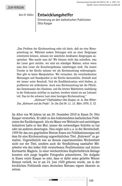 Entwicklungshelfer: Erinnerung an den katholischen Publizisten Otto Kaspar