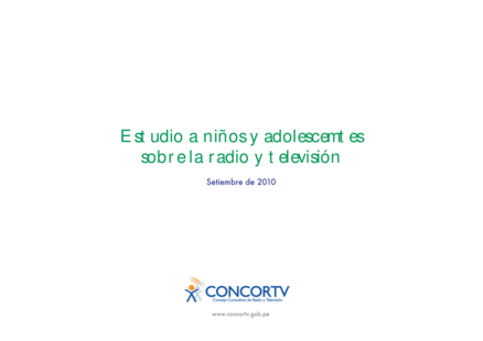 "El objetivo fue conocer las actitudes, hábitos, evaluación y opinión de los niños y adolescentes peruanos sobre los medios de comunicación, especialmente la radio y televisión. Los principales temas considerados fueron la tenencia y uso de medios, hábitos de uso de medios y actividades cotidianas, hábitos de consumo de radio y televisión, control parental, grado de satisfacción, programación infantil, percepción de géneros televisivos y radiales en adolescentes, y medios de comunicación en la escuela. La cobertura del estudio fue de 12 ciudades del Perú: Lima Metropolitana (Lima y Callao), Trujillo, Piura, Chiclayo, Ica, Cajamarca, Huancayo, Arequipa, Cuzco, Puno, Iquitos y Pucallpa. Universo: niños y adolescentes de 7 a 16 años. Diseño muestral: 5.851 personas: 1.110 en Lima Metropolitana y 431 en cada una de las 11 ciudades restantes." (www.concortv.gob.pe, June 16, 2011)